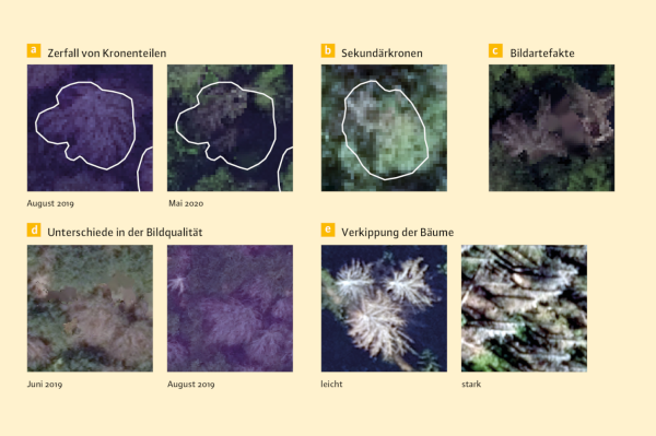 Acht Luftbildaufnahmen von Baumkronen, die die genannten Probleme verdeutlichenZoombild vorhanden